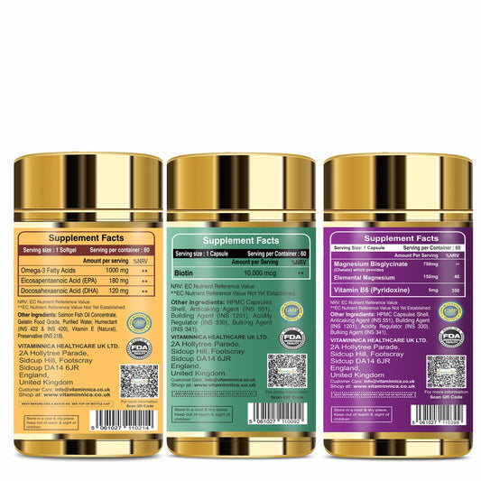Heart Health Bundle- Vitaminnica Omega3+ Biotin+ Magnesium Bisglycinate- 180 Capsules