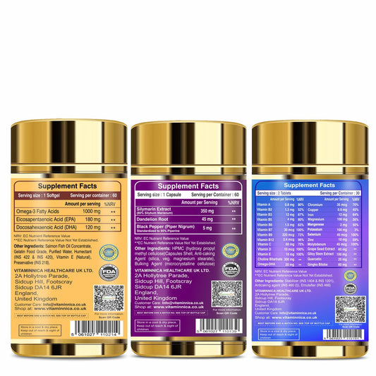 Heart Health+ Liver Detox Bundle- Vitaminnica Omega3+ Milk Thistle+ Multi Vita Men- 180 Capsules