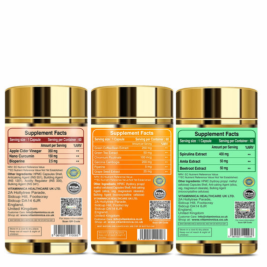 Body Detox Bundle- Vitaminnica Apple Cider Vinegar & Curcumin+ Keto Fat Burner+ Spirulina- 180 Capsules