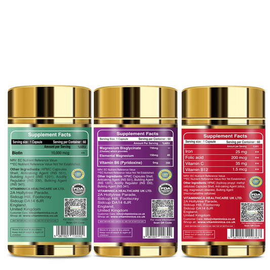 General Wellness Bundle-Vitaminnica Biotin+ Magnesium Bisglycinate+ Iron+Folic Acid- 180 Capsules